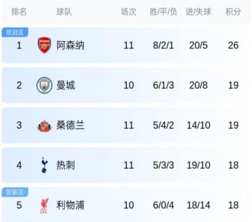 英超第11輪,阿森納客場(chǎng)2-2戰(zhàn)平桑德蘭。最新的積分榜方面,槍手7分優(yōu)勢(shì)領(lǐng)跑,曼城和桑德蘭同積19分,曼城明日凌晨對(duì)陣?yán)锲?。熱刺、利物浦、伯恩茅斯、曼?lián)四隊(duì)同積18分。黑馬本賽季打出比賽發(fā)揮實(shí)在出色。