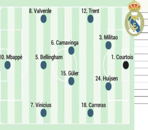 庫(kù)爾圖瓦;亞歷山大-阿諾德、米利唐、赫伊森、阿爾瓦羅-卡雷拉斯;卡馬文加、居萊爾;巴爾韋德、貝林厄姆、維尼修斯;姆巴佩