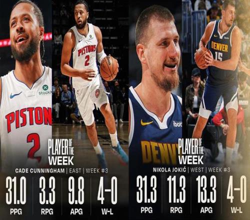 在這輪比賽之前,NBA官方公布了上周的周最佳球員,坎寧安和約基奇分別當(dāng)選。其中,坎寧安上周率球隊(duì)取得了4勝0負(fù),場(chǎng)均可以得到31分3.3籃板9.8助攻。約基奇上周率球隊(duì)取得了4勝0負(fù),場(chǎng)均可以得到31.3分11.3籃板13.3助攻??矊幇策@賽季進(jìn)化還是很明顯的,打得是更有自信了,對(duì)抗提升的同時(shí),在場(chǎng)上失誤數(shù)減少,關(guān)鍵時(shí)刻打得往往特別強(qiáng)硬。而約基奇,不愧聯(lián)盟現(xiàn)役即戰(zhàn)力第一人啊,劃劃水就能拿到場(chǎng)均三雙,得分、籃板、助攻一把抓;本賽季,約老師估計(jì)又要和亞歷山大,字母哥他們競(jìng)爭(zhēng)MVP了。