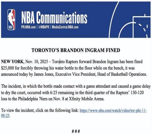 北京時間11月11日,NBA籃球運(yùn)營總裁、執(zhí)行副總裁詹姆斯-瓊斯今日宣布,多倫多猛龍隊前鋒布蘭登-英格拉姆因在替補(bǔ)席上用力將水瓶摔向地面,被處以2.5萬美元罰款。